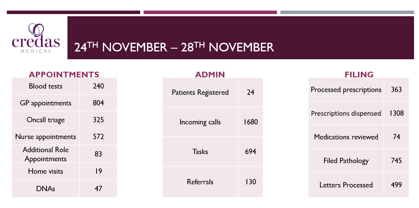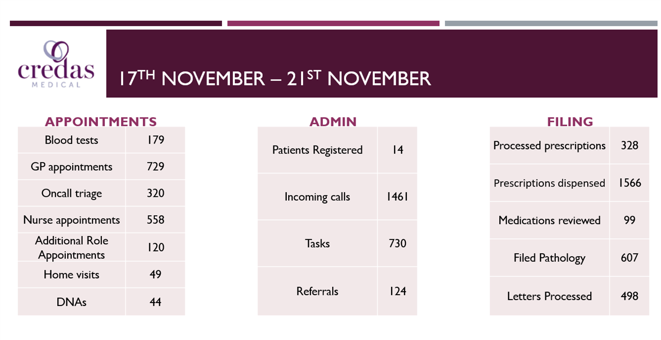 - The on-call triage GP took 4,459 calls and our reception team answered 27,259 calls.